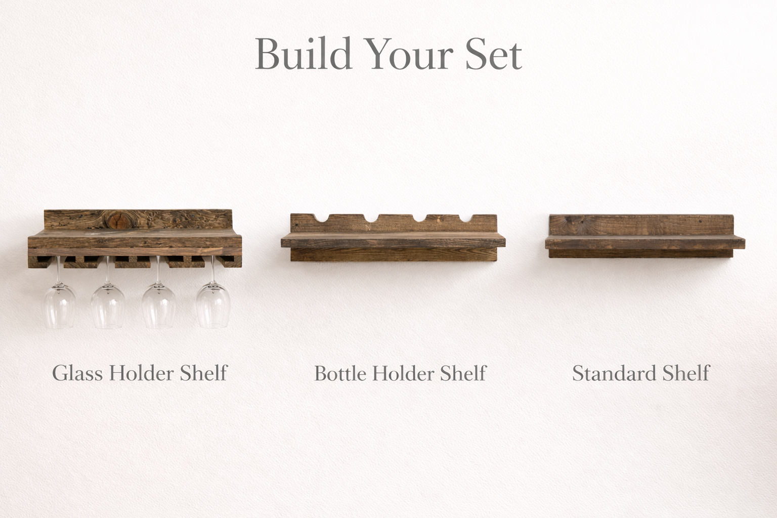 Create a personalized wine rack by selecting your preferred shelf styles, finishes, and lengths. Mix and match components to design a set that feels intentional, architectural, and uniquely yours — with automatic savings as your set grows.